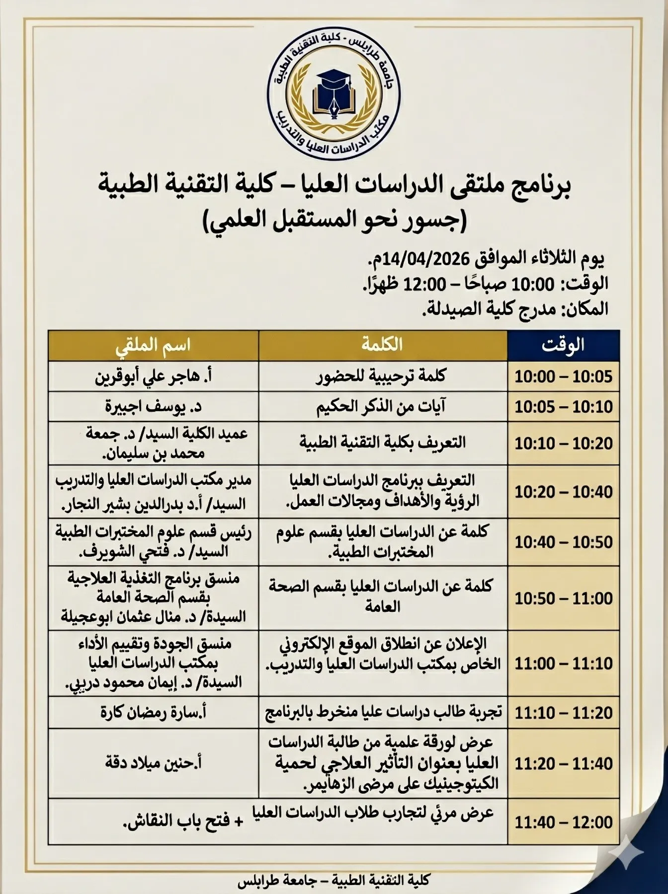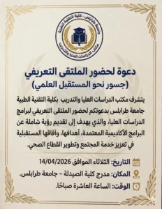 التاريخ: الثلاثاء الموافق 14/04/2026 المكان: مدرج كلية الصيدلة – جامعة طرابلس. الوقت: الساعة العاشرة صباحًا.